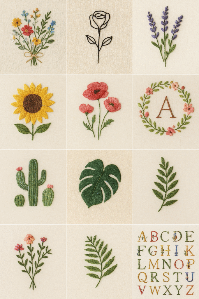 Floral patterns are among the most timeless motifs in embroidery. These designs range from simple outlines to highly detailed compositions.